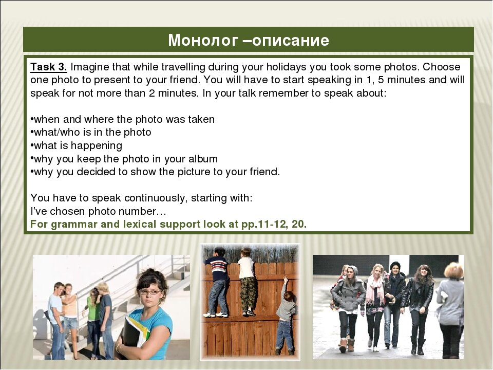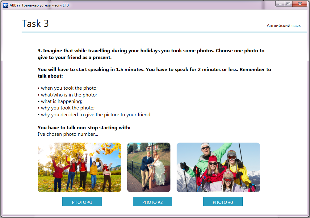 - Старшекласснику предлагаются три фотографии, из которых он выбирает одну. Задание заключается в описании фото согласно предложенному плану.