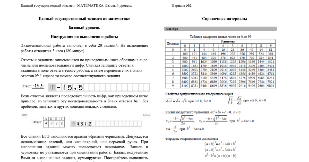 К каждому варианту экзаменационной работы прилагаются следующие материалы: