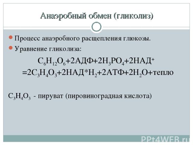 В анаэробных условиях у пирувата другая судьба. Вместо проникновения в митохондрии цитозольный фермент лактатдегидрогеназа превращает пируват в лактат. Хотя лактат сам по себе не используется клеткой в ​​качестве прямого источника энергии, эта реакция также позволяет регенерировать НАД+ из НАДН. НАД+ является окисляющим кофактором, необходимым для поддержания потока глюкозы посредством гликолиза. Гликолиз производит 2 АТФ на молекулу глюкозы и, таким образом, обеспечивает прямое средство производства энергии в отсутствие кислорода. Этот процесс расщепления глюкозы в отсутствие кислорода удачно назван 9.0013 анаэробный гликолиз .[1]