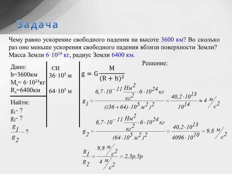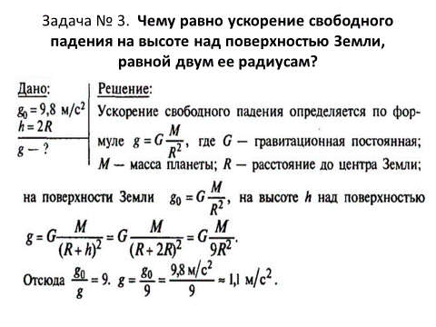 4. Чему равно ускорение свободного падения на высоте, равной радиусу Земли?