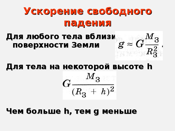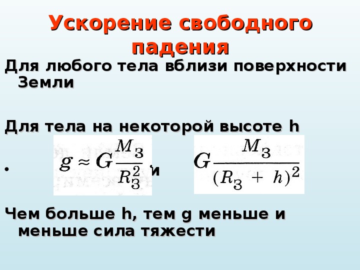 1) В соответствии со вторым законом Ньютона ускорение обратно пропорционально массе, следовательно, ускорение свободного падения не зависит от массы: . 3) Земля неинерциальная система отсчета, поэтому ускорение не зависит от массы. 4) Земля не имеет точной шаровой формы, поэтому нельзя применять закон всемирного тяготения. | ||||||||||