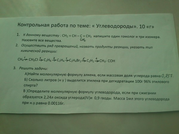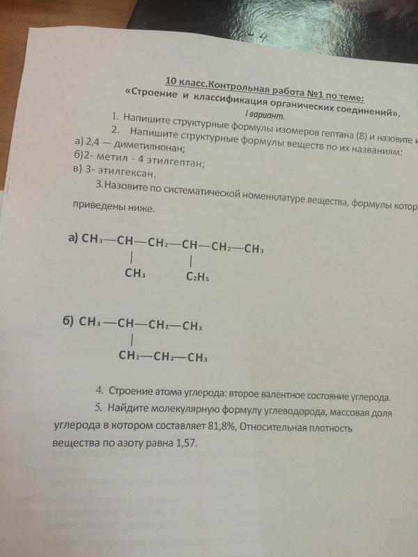 Контрольная работа № 1 по теме «Строение и классификация органических соединений». 10 класс