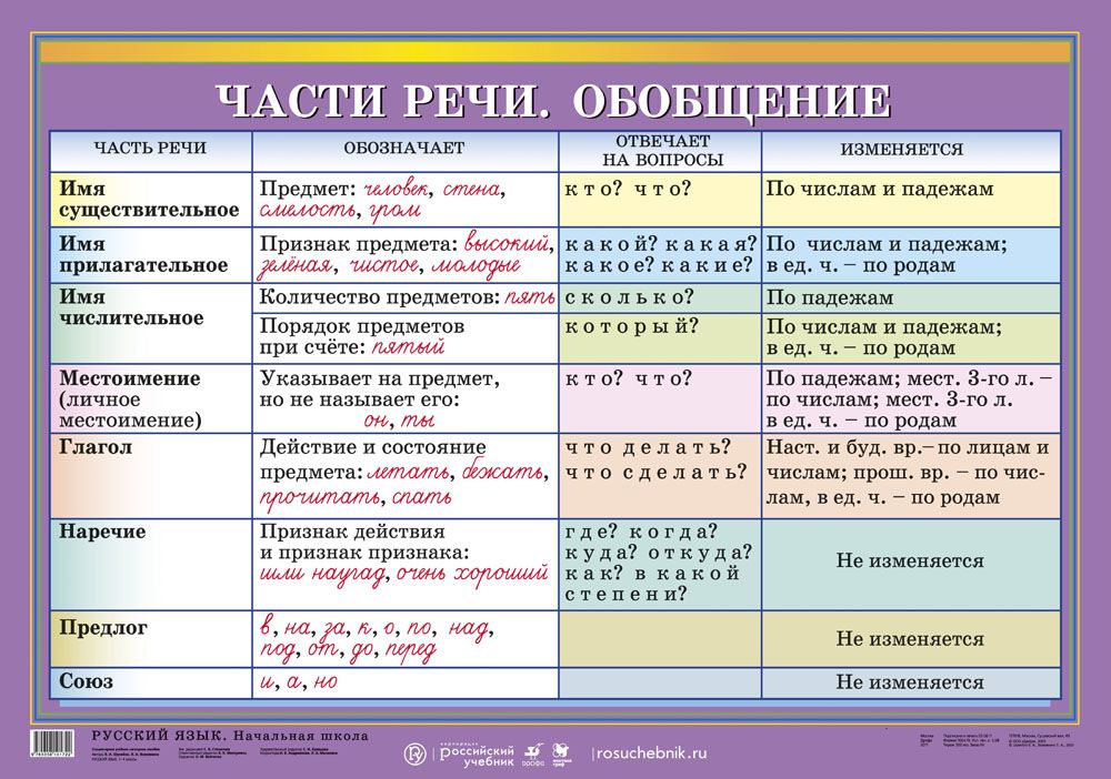 ТАБЛИЦА ЧАСТЕЙ РЕЧИ.