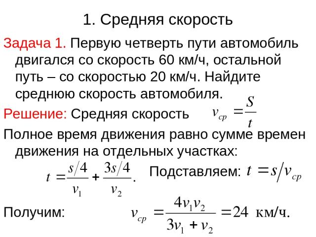 Задача 1. Первые 105 км автомобиль ехал со скоростью 35 км/ч, следующие 120 км — со скоростью 60 км/ч, а последние 500 км — со скоростью 100 км/ч. Найдите среднюю скорость автомобиля на протяжении всего пути.