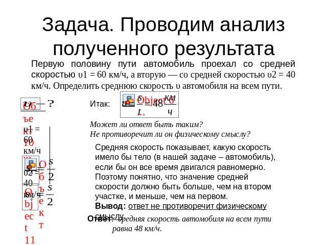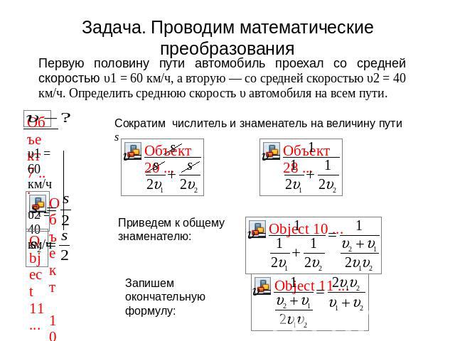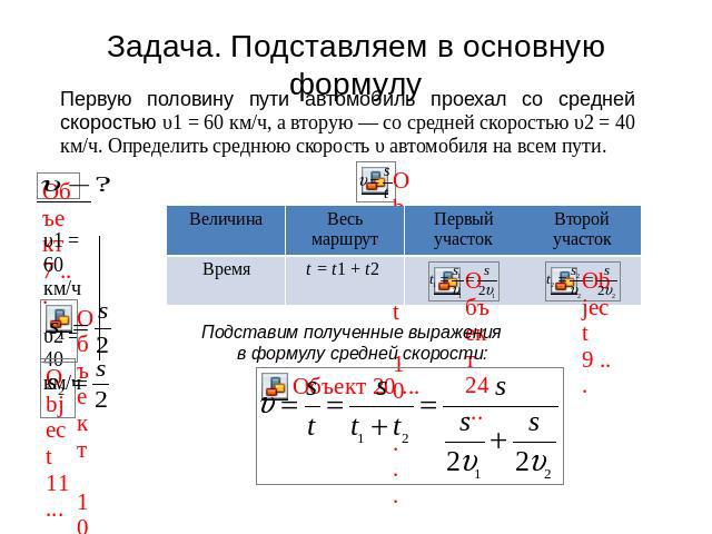 Автомобиль проехал первую половину пути со скоростью υСредняя скорость – не самое сложное понятие в математике и физике. Однако простота этого понятия довольно часто оказывается обманчивой. Необходимо постоянно помнить, что средняя скорость – это величина, равная отношению пути, пройденного телом, ко времени, за которое пройден этот путь. Рассмотрим серию задач из (ФИПИ) для проведения ОГЭ.