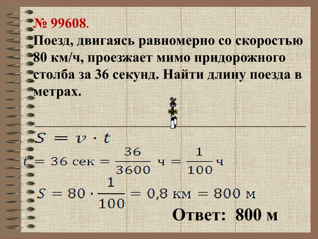 99608. Поезд, двигаясь равномерно со скоростью 80 км/ч, проезжает мимо придорожного столба за 36 секунд. Найдите длину поезда в метрах.