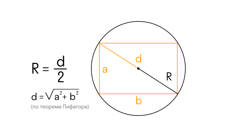 Рассмотрим прямоугольный треугольник с гипотенузой и катетами и . Центр этой окружности лежит на середине гипотенузы, а ее радиус равен половине гипотенузы