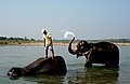 Два слона были взяты к реке, чтобы выпить и принять ванну.