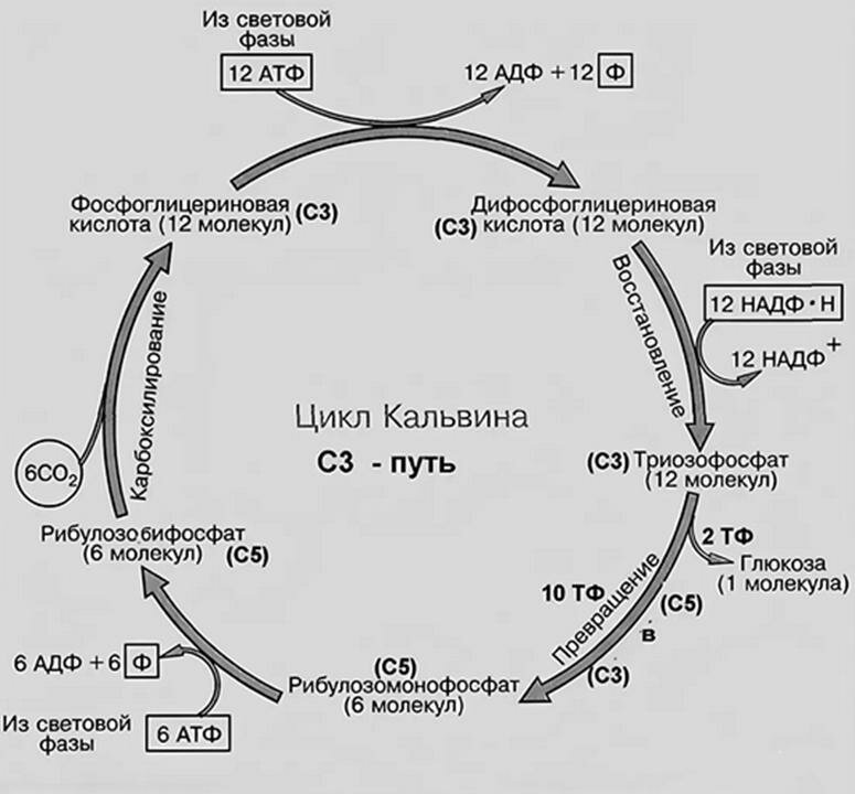В них используются энергии НАДФ.Н 2 и АТФ, которые были преобразованы, когда шла световая фаза фотосинтеза. Цикл указанных реакций именуется «циклом Кальвина». Его можно представить следующим образом: